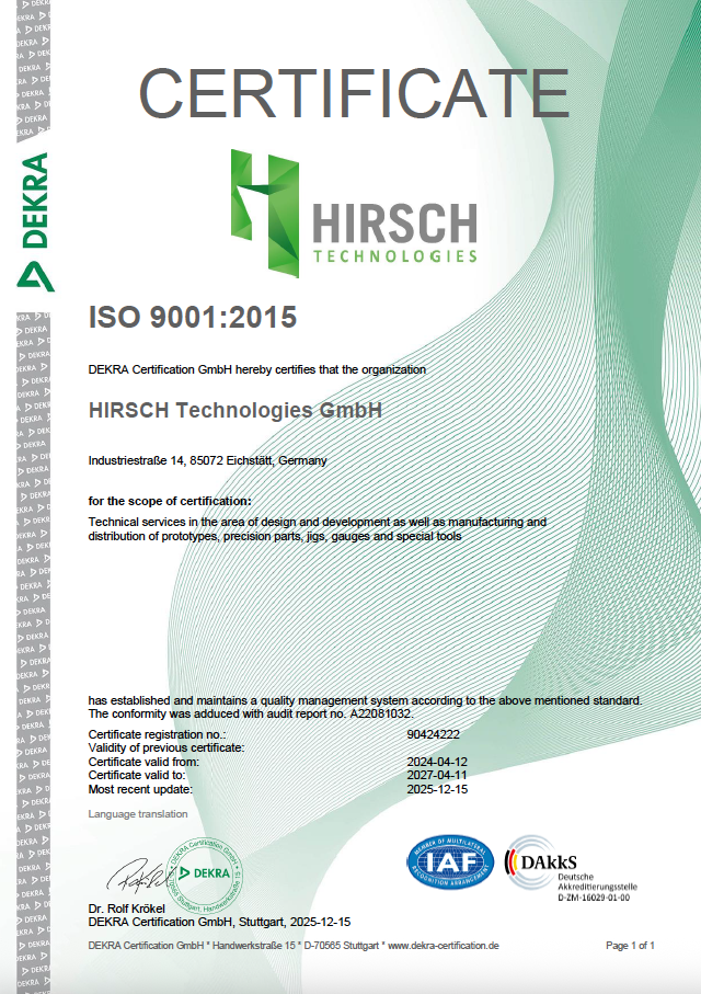 HIRSCH Technologie GmbH specialises in the development and manufacture of high-precision components, assemblies and innovative products and services for the aerospace and defence sector. We stand for the highest quality, reliability and forward-looking, creative solutions. Open, direct communication forms the basis for a trusting and successful co-operation with our customers and partners. Our certification according to DIN EN 9100 and DIN EN ISO 9001 emphasises our consistent striving for quality in thought and action.